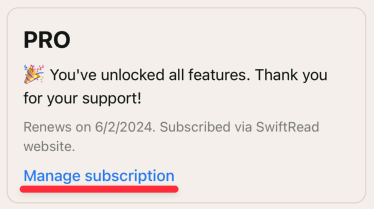 Follow the "Manage subscription" link in the Settings page within SwiftRead to cancel your subscription or manage it, such as to change your payment method.